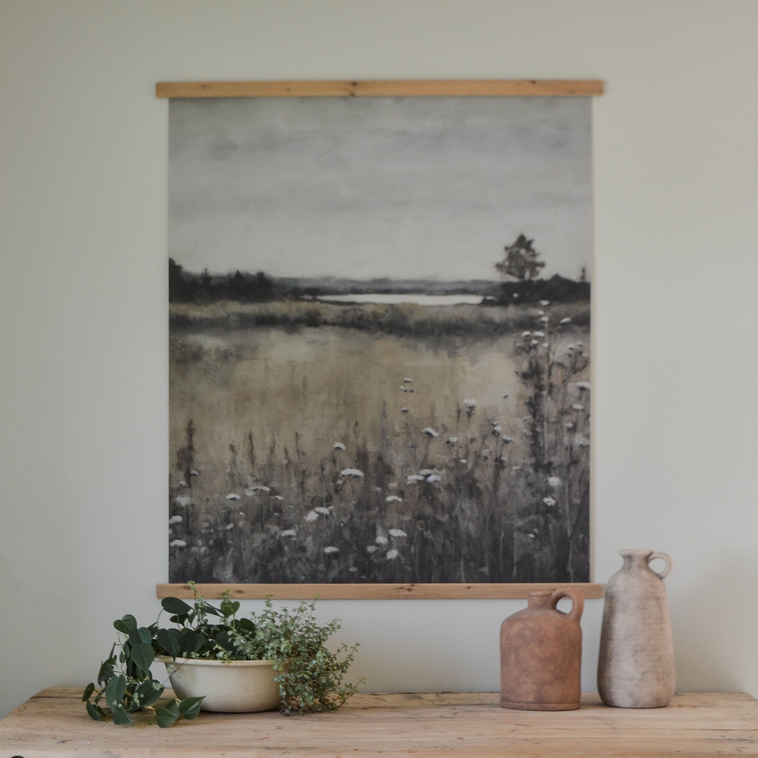 Bring serene, moody beauty to your home with the Edge of the Moor canvas tapestry. This art piece captures a quiet, windswept landscape in earthy, muted tones—evoking the wild, untamed charm of the moors. Printed on cotton canvas and framed with natural wood slats at the top and bottom, it blends rustic texture with timeless artistry.