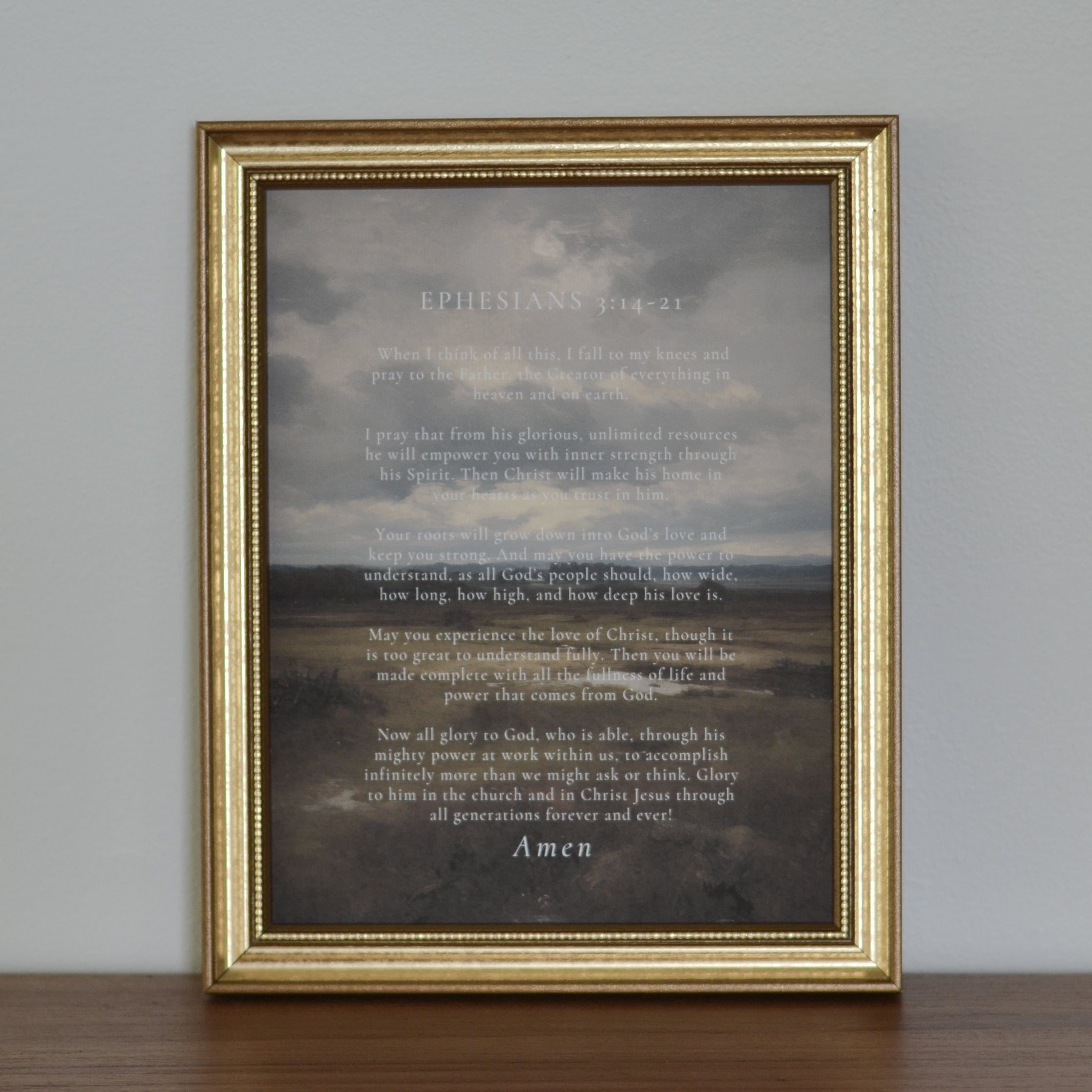 This Ephesians 3:14–21 art print features Paul’s powerful prayer, reminding us of God’s immeasurable love, strength, and glory. Set against a moody, painterly landscape, the scripture takes center stage, bringing both beauty and truth into your home.