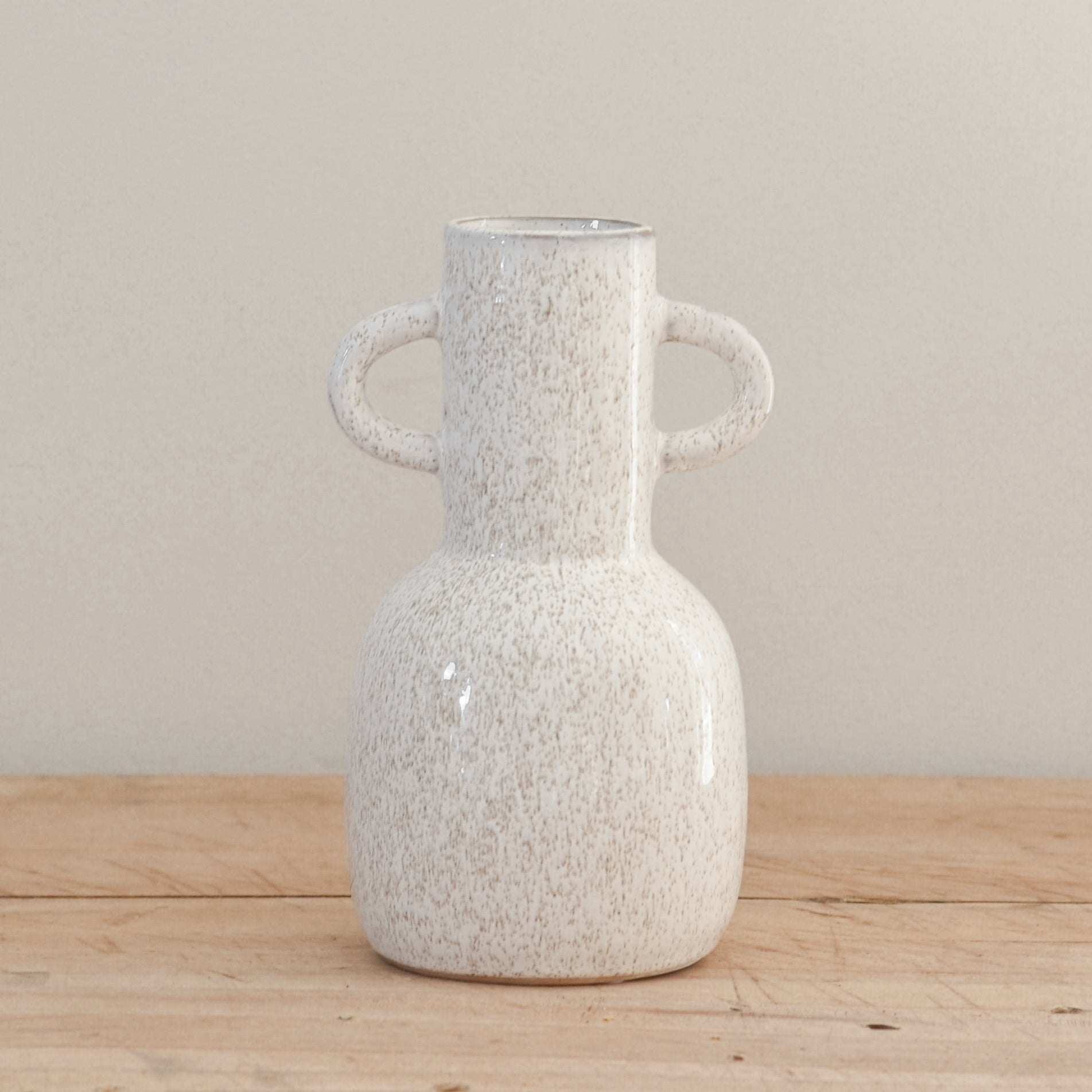The Ashford Vase combines minimalist design with earthy elegance, featuring a beautiful speckled finish in soft gray and brown tones. With its unique two-handle shape, this ceramic vase adds a touch of drama and sophistication to any space. Ideal for dried botanicals, fresh greenery, or standing alone as a statement piece, the Ashford Vase seamlessly fits into any color scheme.