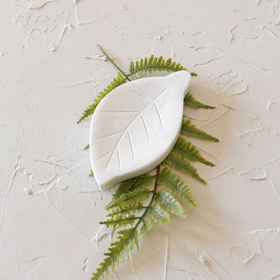 The Fleur Marble Spoon Rest brings natural beauty to your kitchen. Carved from solid white marble into a delicate leaf shape, this spoon rest features etched details that enhance its organic charm.