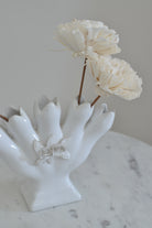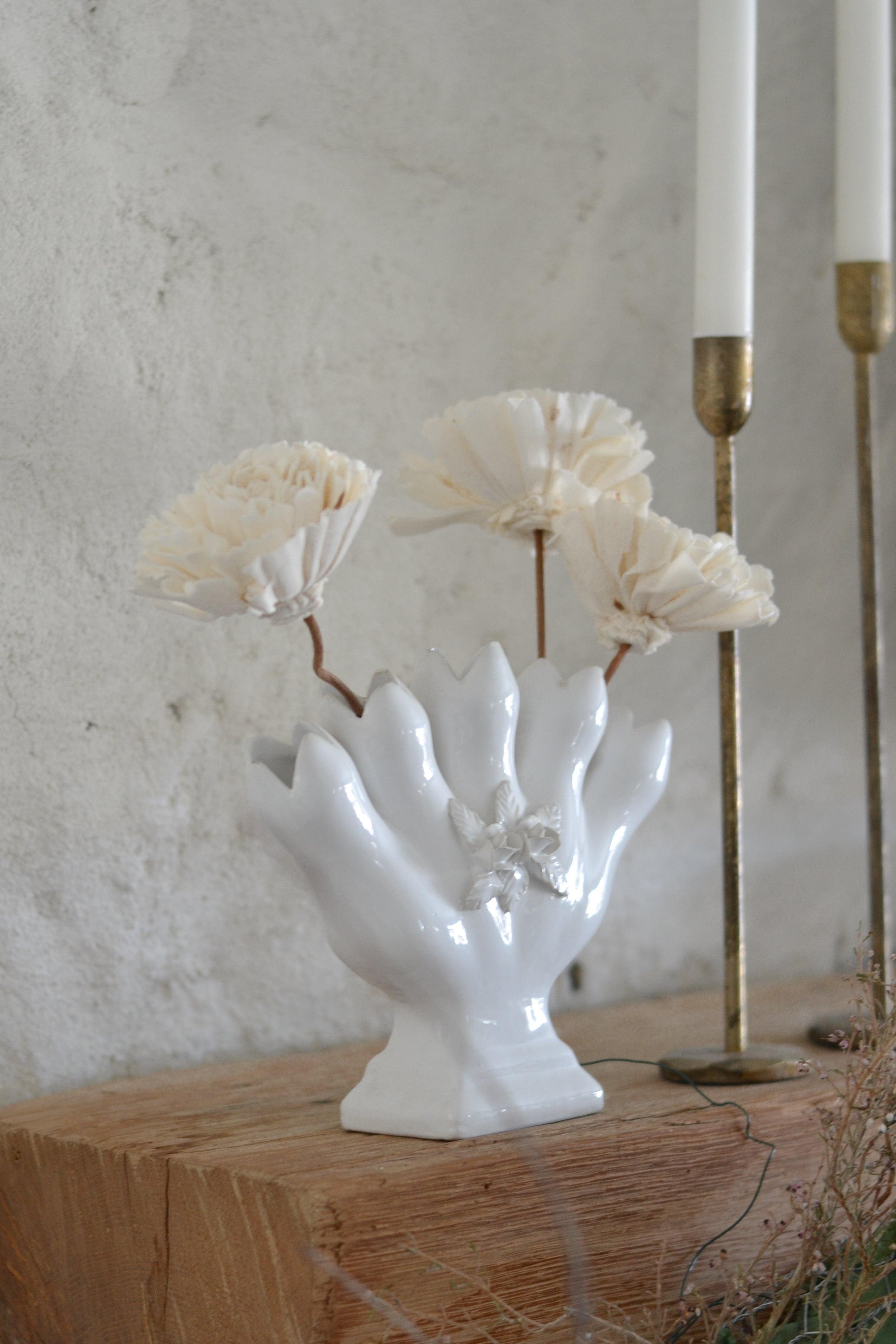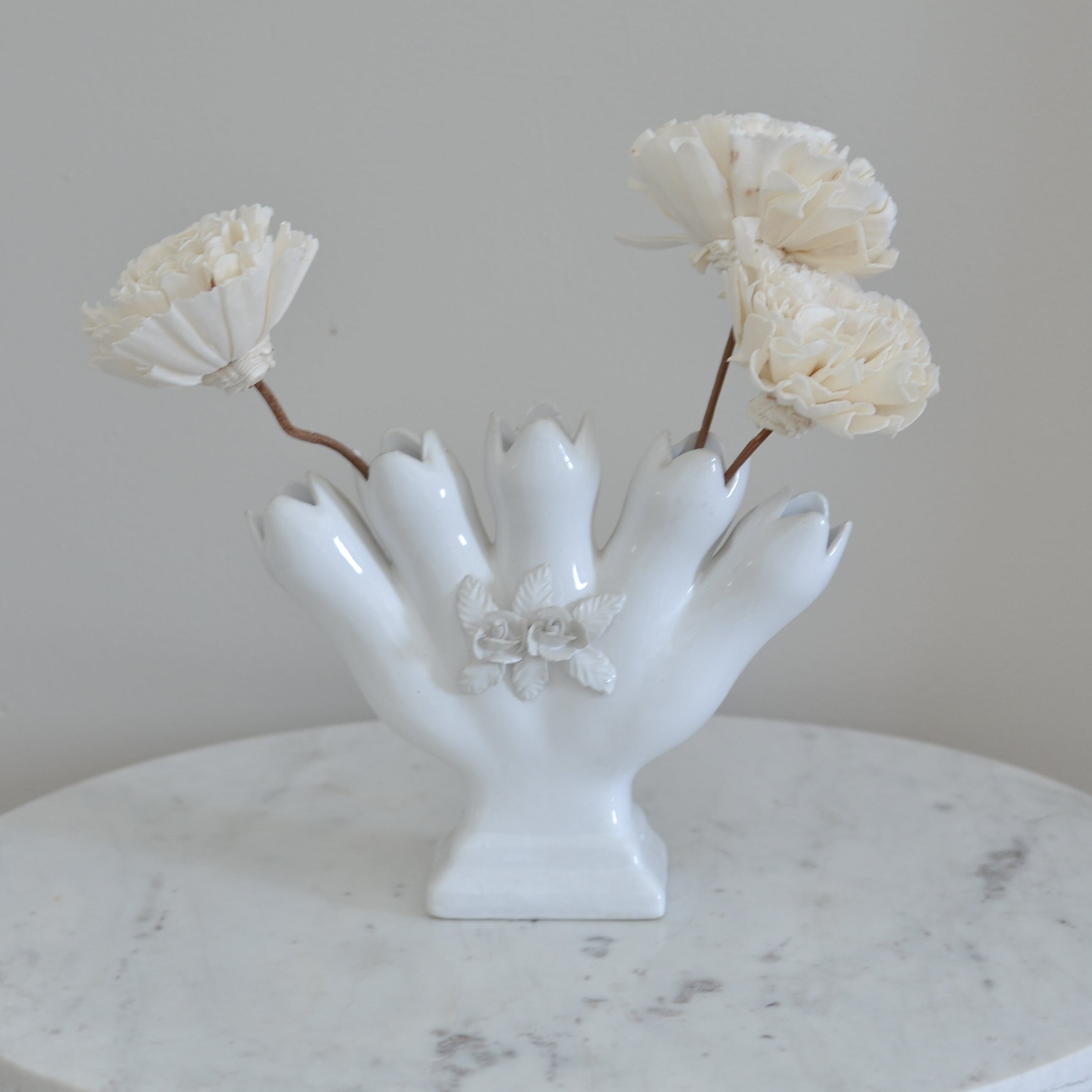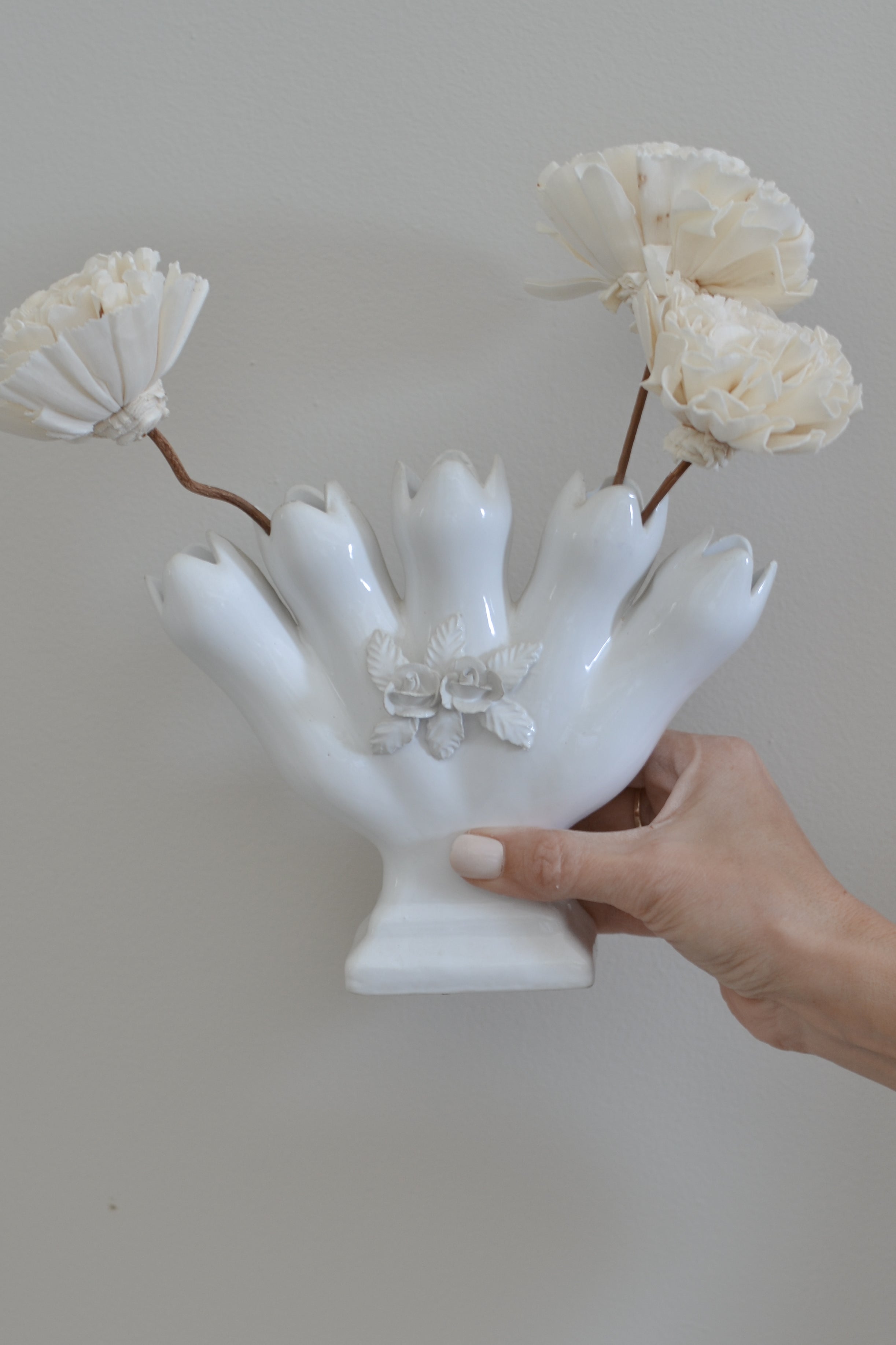 A lovely vintage Alcobaca white ceramic vase with a sculptural, petal-like silhouette and delicate floral detail. Its glossy finish and soft curves give it a romantic, old-world feel. Beautiful styled with fresh or dried blooms, it adds an elegant touch to a mantel, shelf, or bedside.
