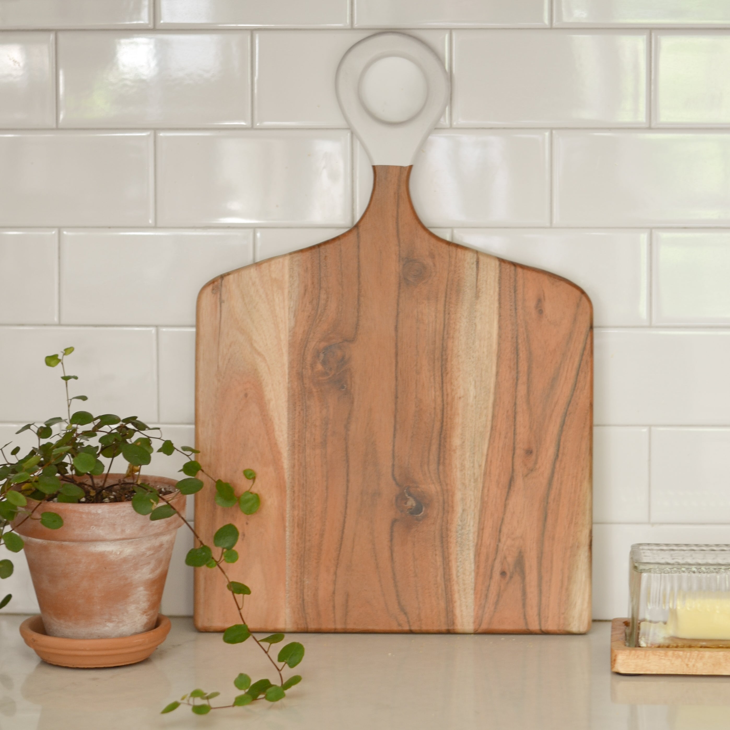 This cutting board brings functionality and beauty to your kitchen. The white handle adds a modern touch.