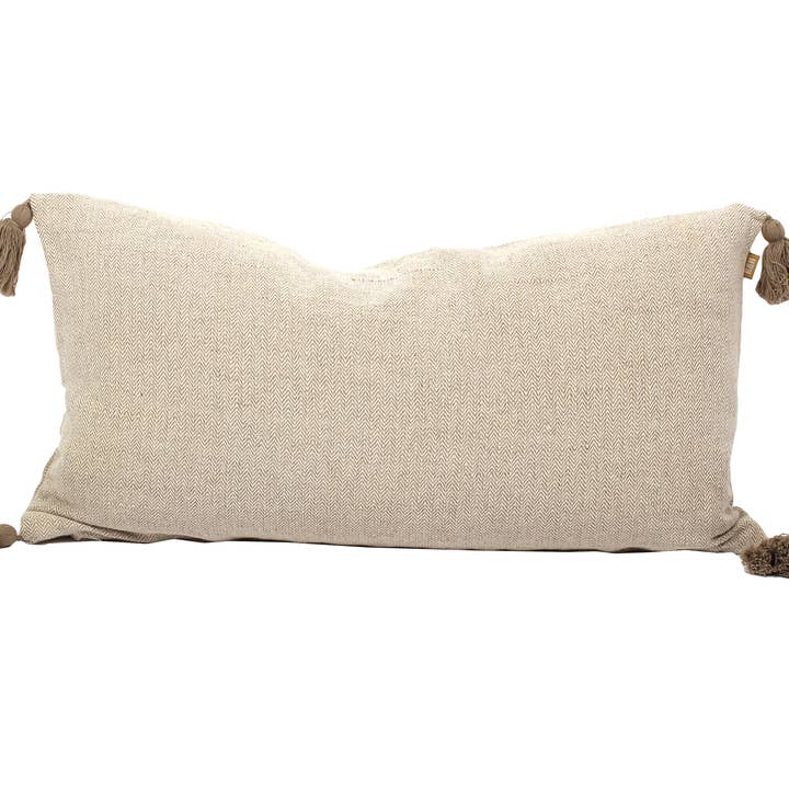 Add comfort and style to any space with our long lumbar pillow. Featuring a soft taupe herringbone weave, this long pillow brings a cozy, neutral touch to sofas, beds, or reading nooks. The tasseled corners add a subtle decorative detail, while the polyfill ensures plush support. A hidden zipper makes the cover easy to remove and care for, combining beauty and practicality in one versatile piece.