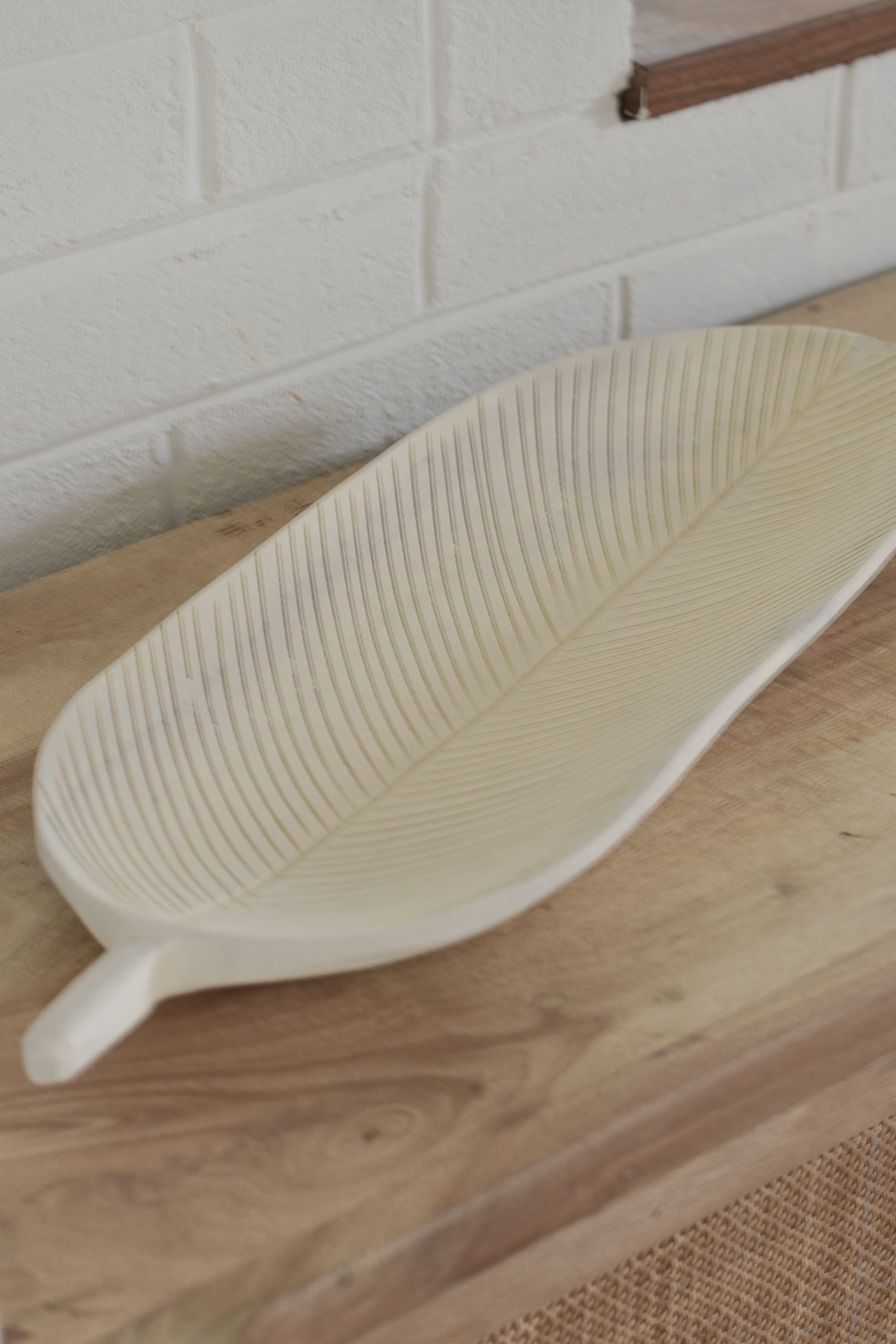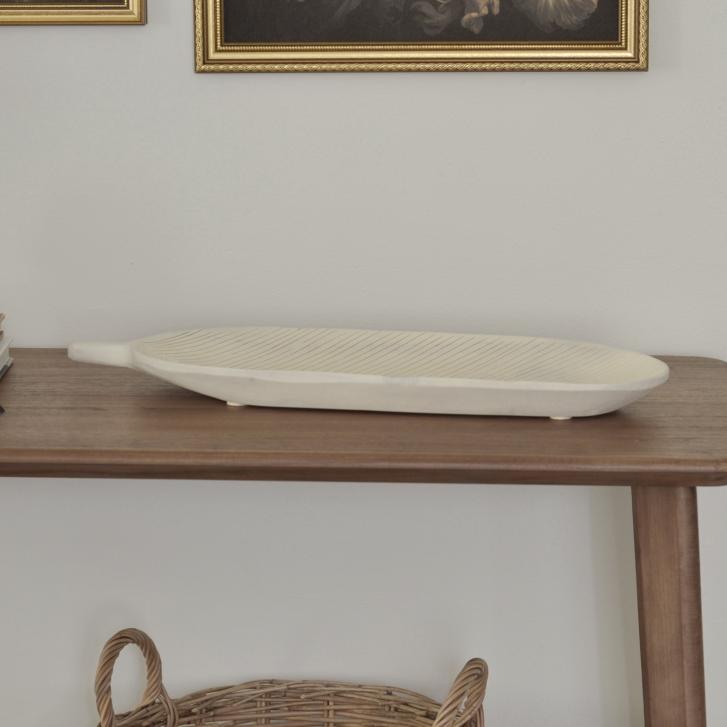 Bring nature-inspired charm to your home with this large mango wood leaf tray. Carved in the graceful shape of a leaf and finished in a soft cream color, this statement piece adds organic beauty to any space. At 20" long, it’s perfect for displaying candles, holding decorative accents, or serving small bites at a gathering.