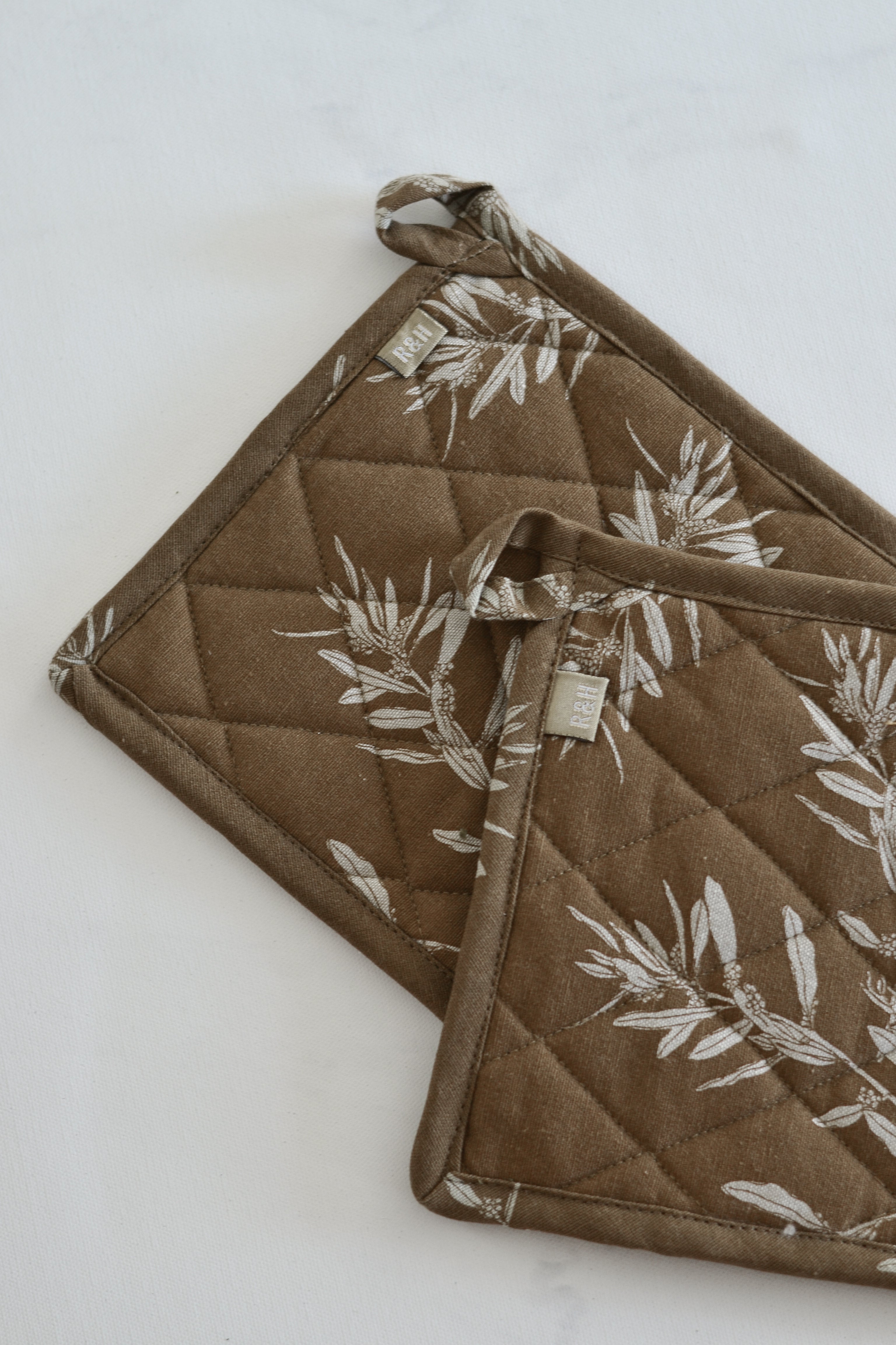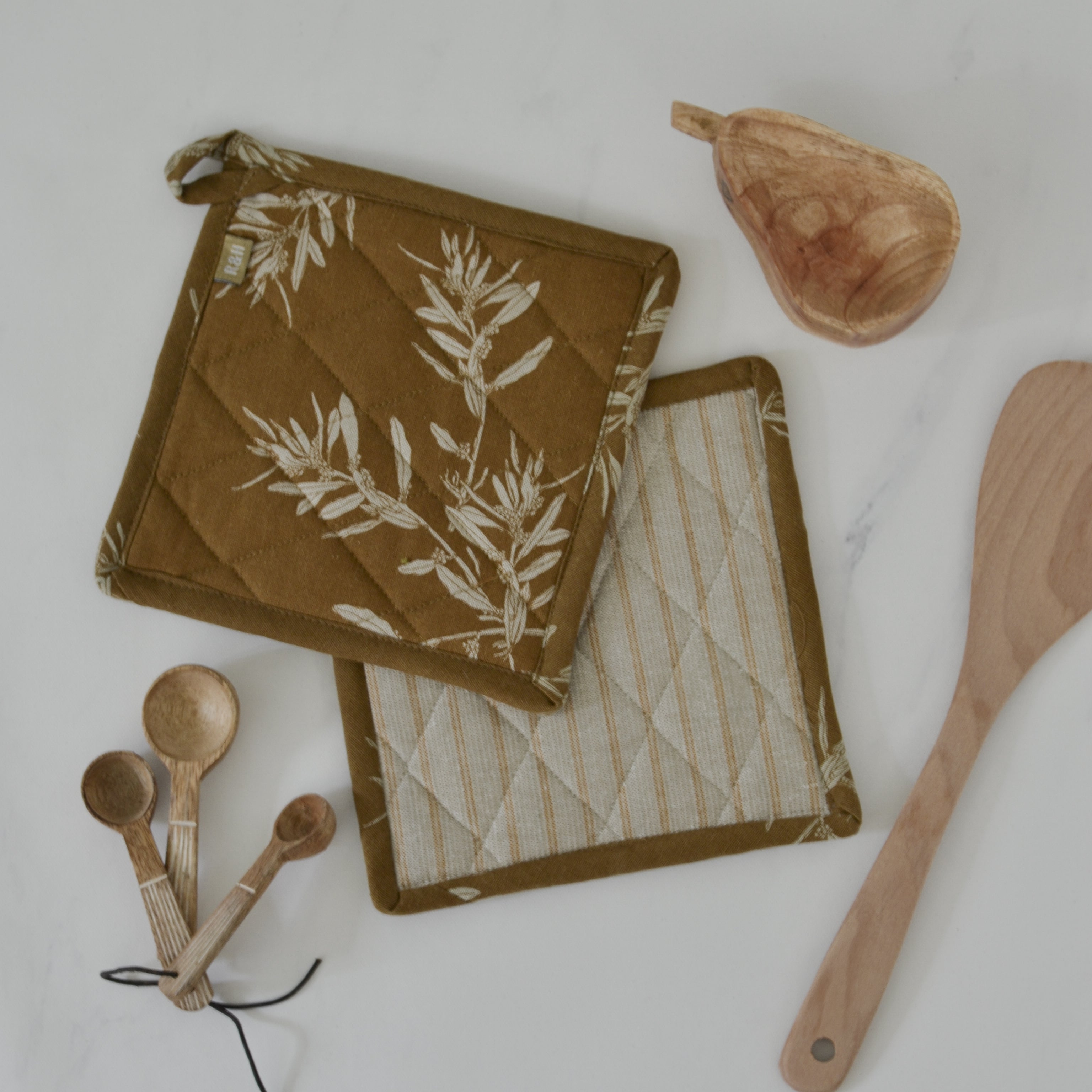 Our quilted trivet/pot holder features an olive branch print on one side and a contrasting stripe on the reverse side. Quilted for extra protection from the heat. Use to protect hands as well as table and counter tops under a hot plate or pot.