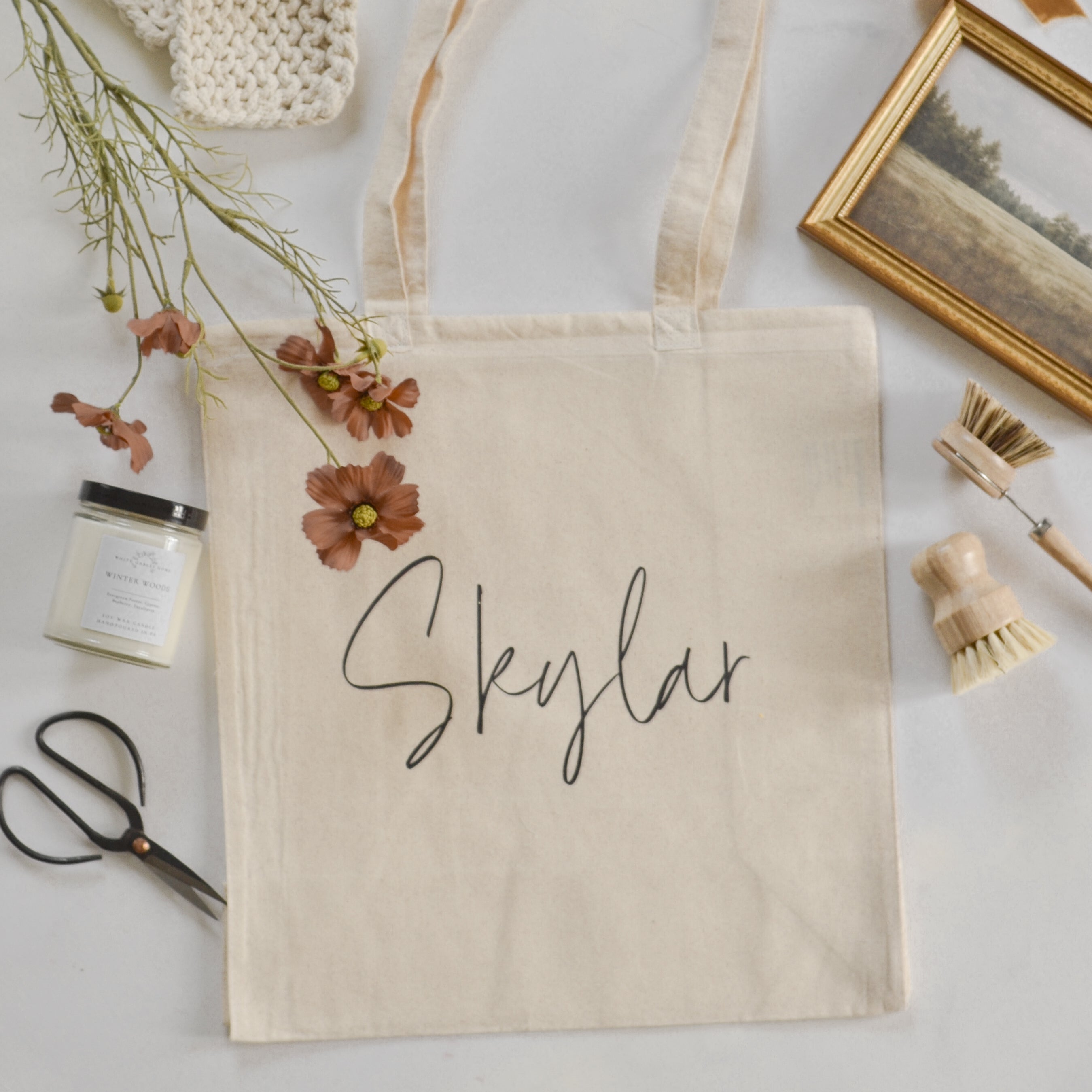 Elevate your gift-giving with the Signature Style Tote Bag—a thoughtful and elegant alternative to traditional wrapping. Personalized with a beautifully scripted name, this tote becomes part of the gift itself, combining practicality with a personal touch.