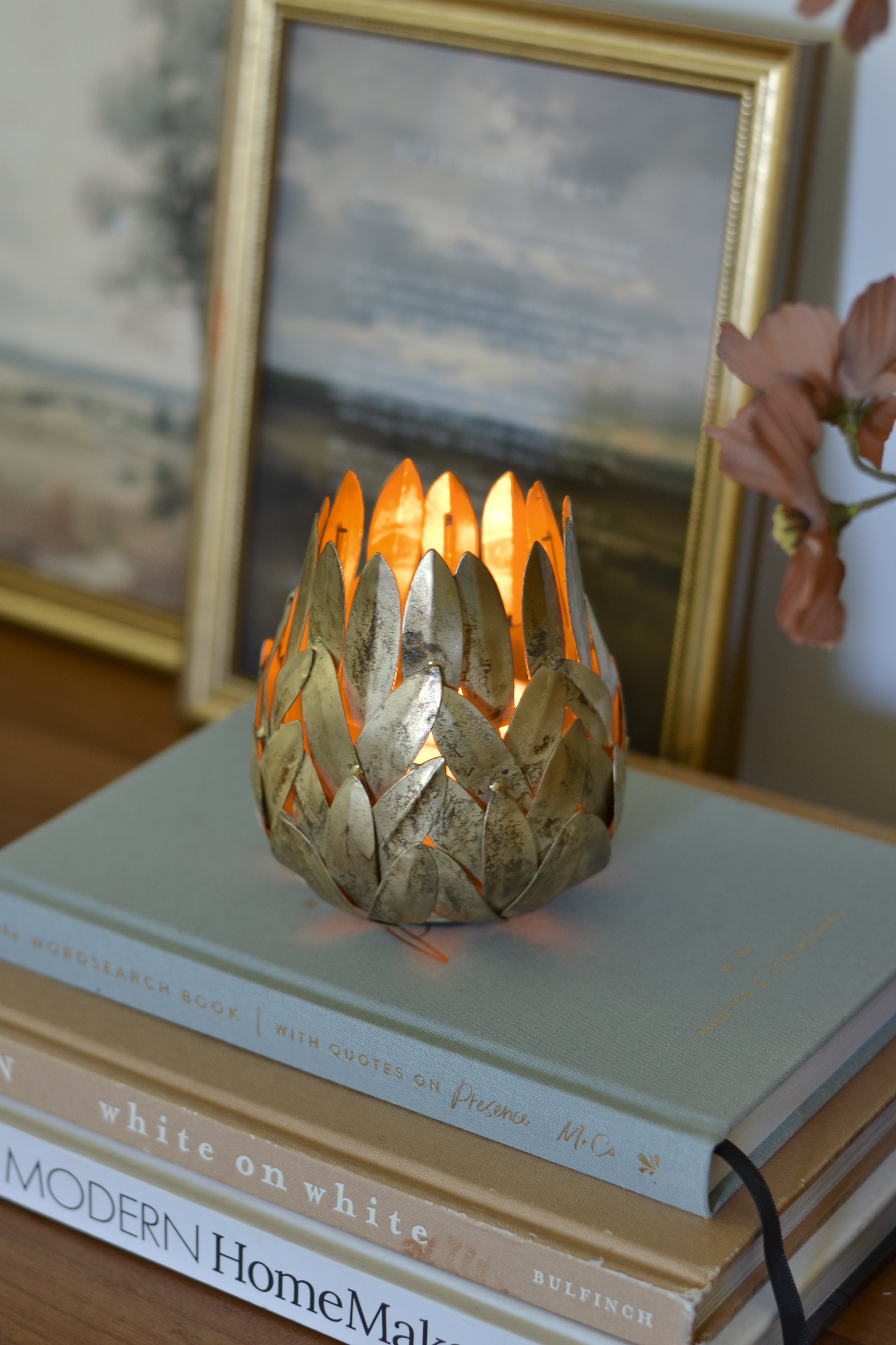 Add a touch of elegance and warmth to your home with this brass leaf votive candle holder. Its intricate leaf design beautifully reflects candlelight, creating a cozy and inviting atmosphere in any room. Perfect for mantel displays, tablescapes, or quiet evenings, this votive holder transforms everyday spaces into a charming and serene retreat.