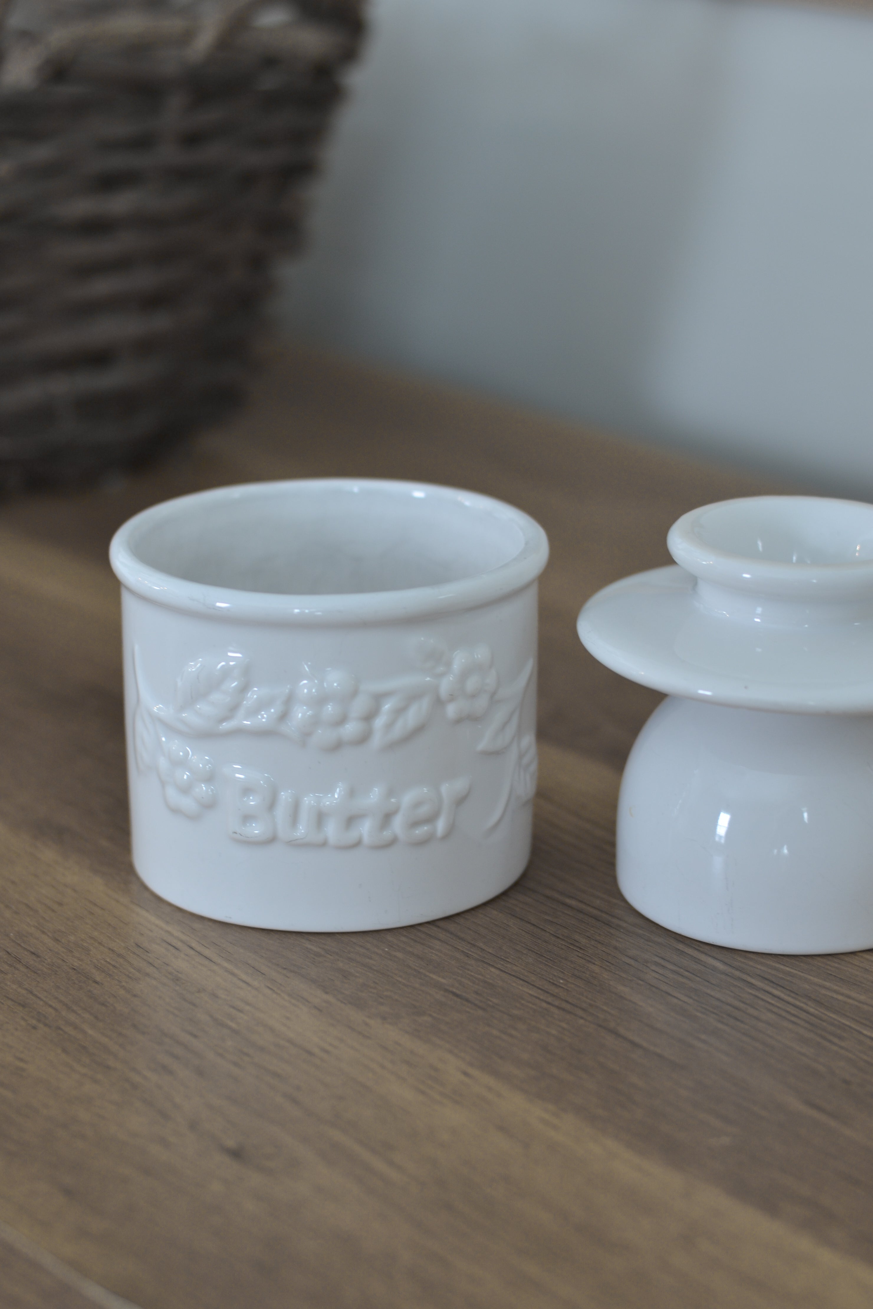This classic French butter bell is crafted from white porcelain and labeled with "butter" on one side and "beurre" on the other.
