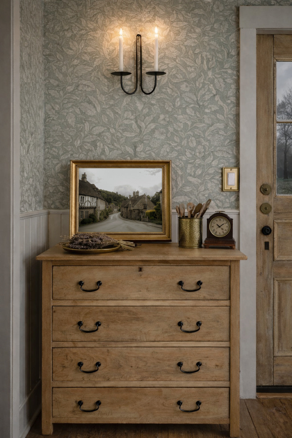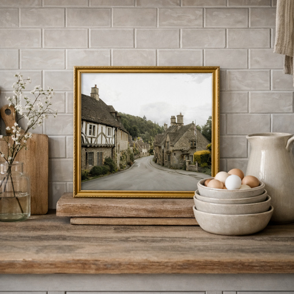 A gently winding Cotswold village road lined with charming stone cottages captures the warmth and simplicity of English countryside living. With its soft, muted palette and timeless character, this piece brings cozy, storybook charm to your home.